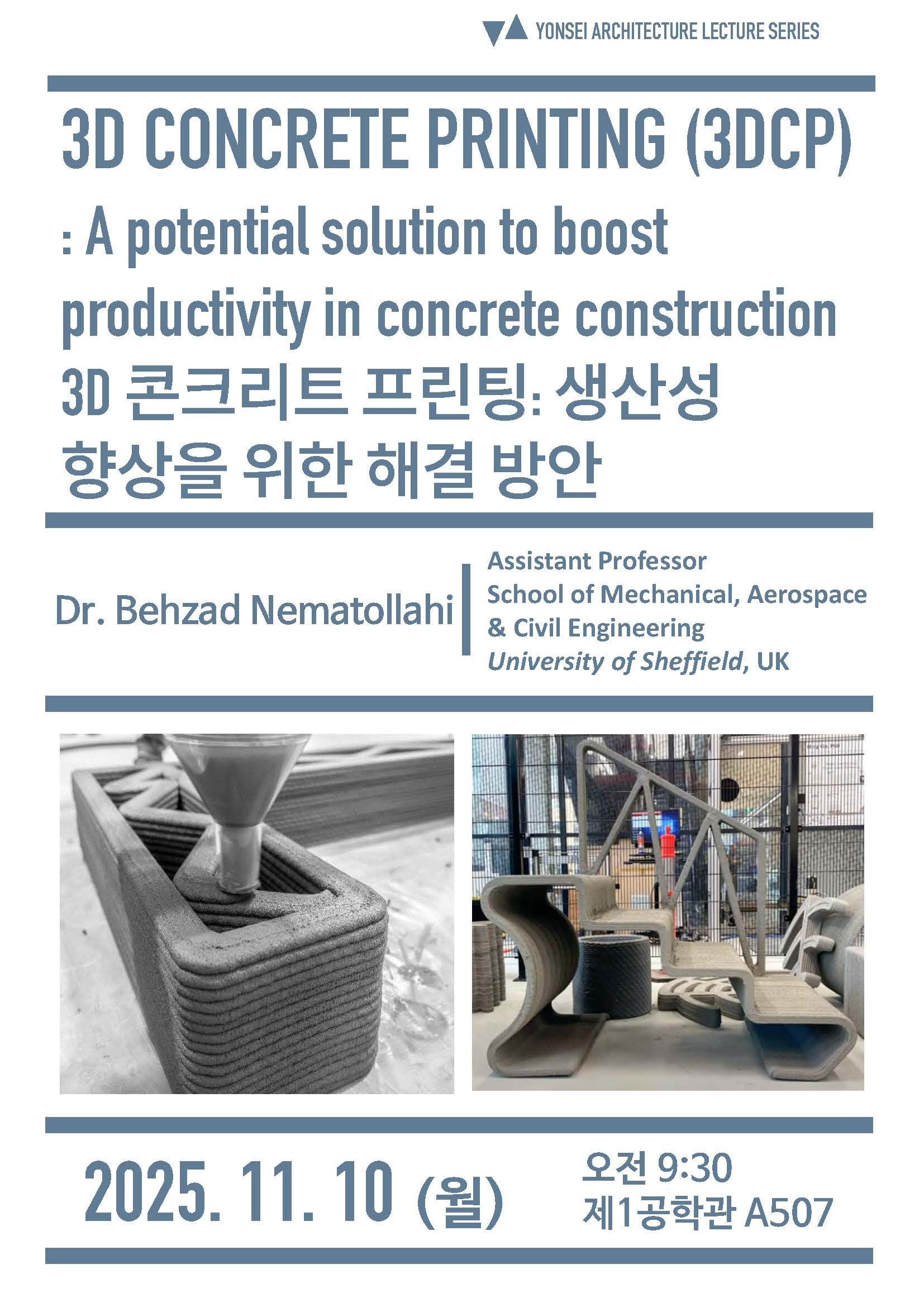 건축공학과 세미나 안내 - 3D 콘크리트프린팅: 생산성향상을위한해결방안(2025.11.10. 월)