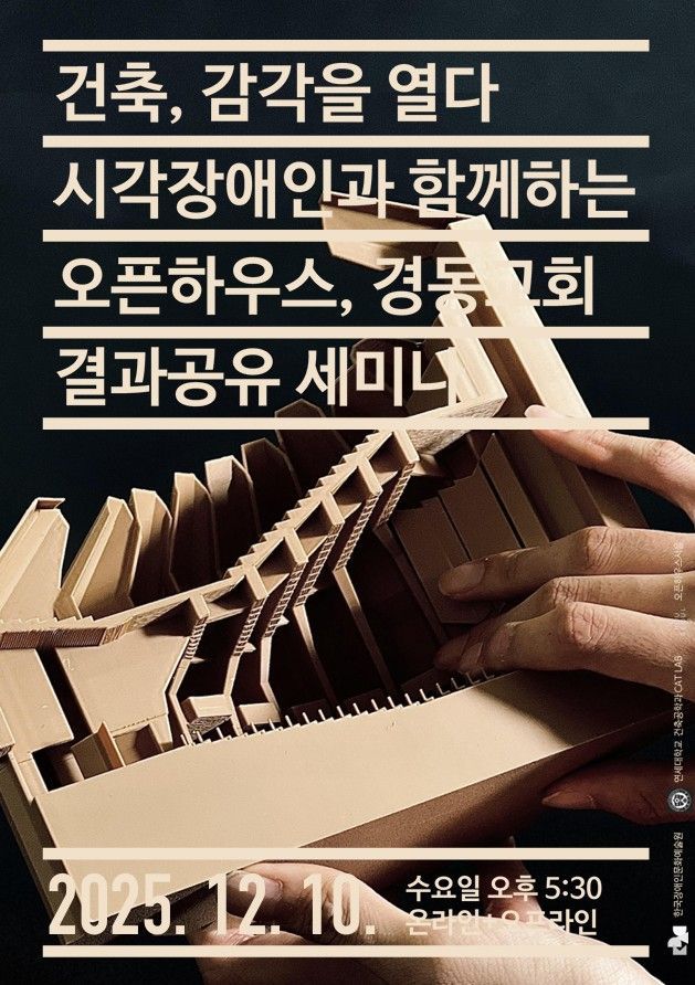 <건축, 감각을 열다 – 시각장애인과 함께하는 오픈하우스, 경동교회>는 연세대학교 CAT건축도시디자인연구실과 오픈하우스서울이 함께 진행한 다감각 건축 체험 프로그램으로, 김수근의 경동교회를 배경으로 시각장애인과 비시각장애인이 짝을 이루어 촉각·청각 등 다양한 감각을 통해 건축을 새롭게 경험하는 자리였습니다. 이번에 그 결과를 공유하고 다양한 분들의 의견을 듣는 자리를 마련하고자합니다. 본 세미나는 온라인(Zoom)과 오프라인(신촌 연세대학교)으로 동시에 진행되며 정확한 주소는 신청자 이메일로 개별 안내드립니다.