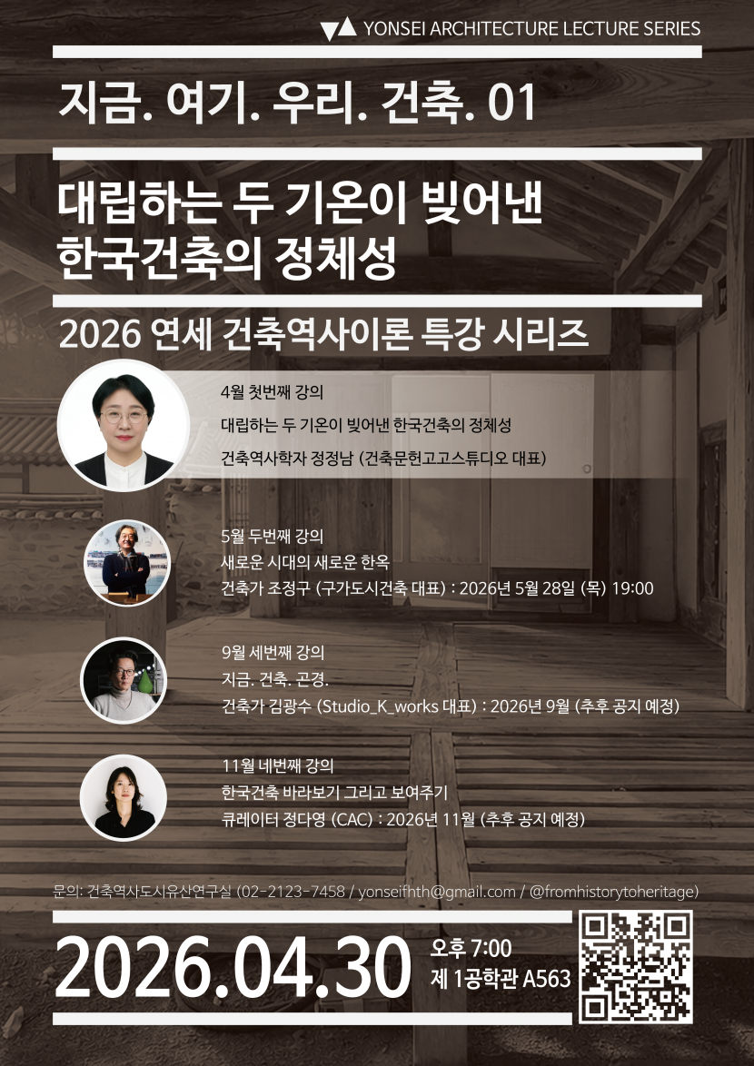 2026년 연세대학교 건축공학과 건축역사이론 특강시리즈는 ‘지금.여기.우리.건축’이라는 주제로 건축역사, 건축설계, 건축큐레이팅의 전문가분들을 모시고 우리가 살아 가고 있는 이 땅의 건축에 대한 이야기들을 나누어보고자 합니다.