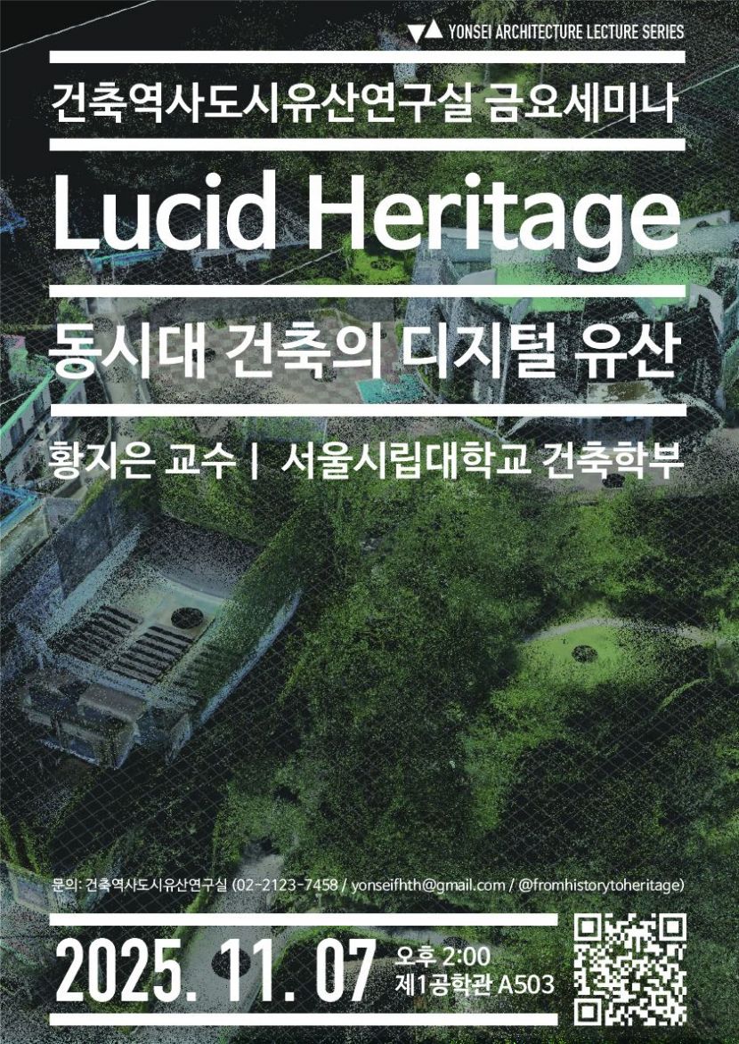 2025년 11월 7일 오후 2시에 열리는 금요세미나에서는 서울시립대학교 건축학부의 황지은 교수님을 모시고 ’Lucid Heritage‘라는 제목으로 3D 스캐닝 등 다양한 디지털 툴을 통해 동시대 건축을 디지털 유산으로 남기는 것에 대한 이야기를 듣고자 합니다.