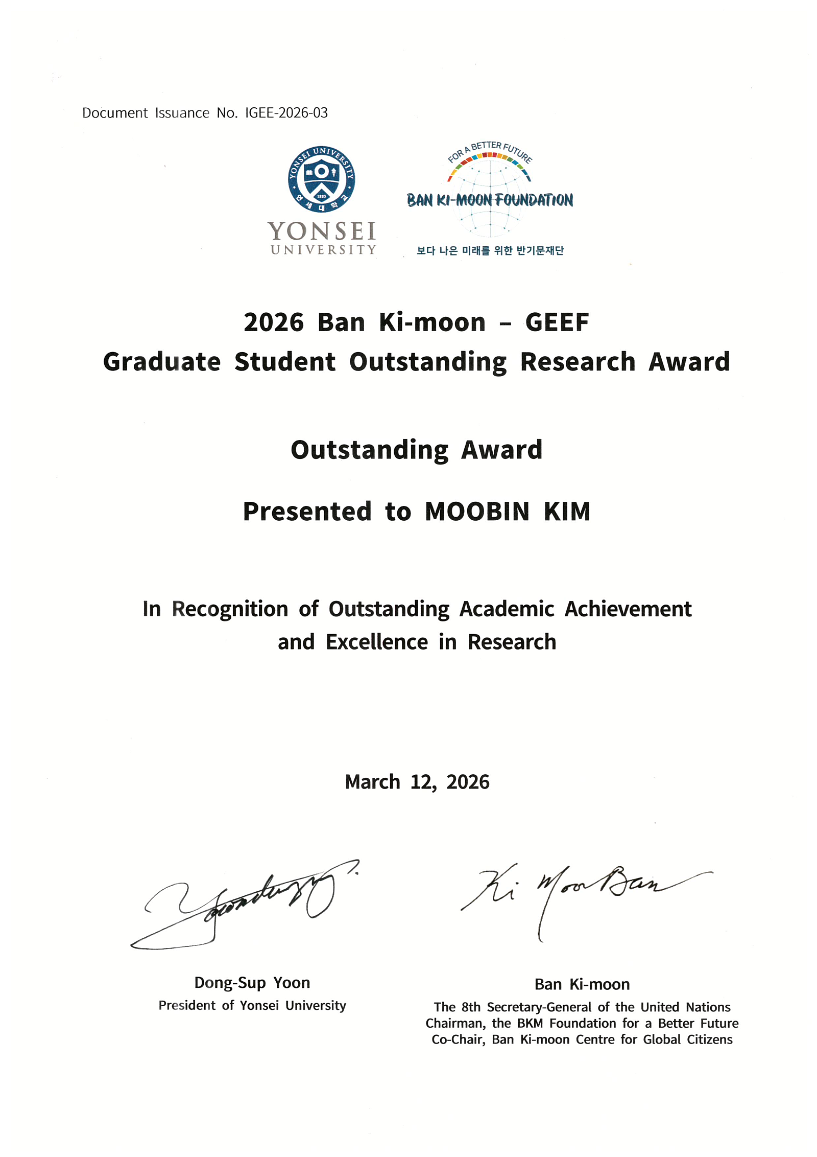 이 상은 반기문 재단과 연세대학교가 GEEF 2026에서 탁월한 학문적 성취와 연구 우수성을 인정하여 수여하는 상입니다.
