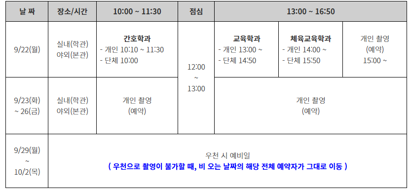 ⊙ 2학기 촬영은 예약제로 진행 (예약 없이 방문 시 대기 시간 길어질 수 있음.) ⊙ 예약 변경 (당일 변경 적용 X) - 세븐칼라사진 홈페이지 → 우측 상단 스케줄 등록 → 학교, 학번, 비번 → 로그인 ⊙ 우천 예보 시, 학교 및 세븐칼라사진 홈페이지 공지 확인 (전날 15시 기준) ⊙ 개인 사진만 촬영 (아래 3개 학과만 단체 사진 촬영) - 교육학과, 체육교육학과, 간호학과 (일정표 확인) |