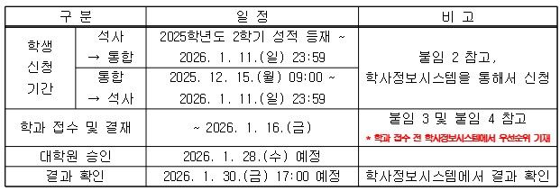 가. 학사정보시스템에는 2025년 12월 15일부터 신청 메뉴가 활성화 되나, 통합으로의 과정 변경은 학점 요건이 있어 성적이 등재되는 시점부터 신청이 가능합니다.(성적 등재는 성적 정정 등의 학사 일정에 따라 변동되는 경우가 많아 정확한 기간을 명시하기가 어려우며, 대략 2026년 1월 초에 등재됨. 실제 신청 기간은 약 1주가 안되는 기간이기에 반드시 성적 등재 이후 기간 내 신청)
